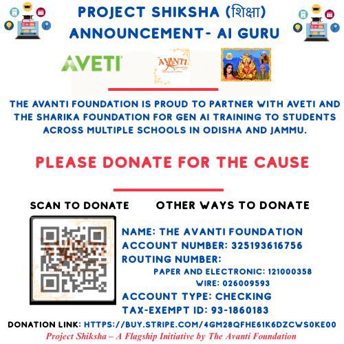 Namaskar 🙏 – We at The Avanti Foundation, AVETI, and Sharika Foundation are empowering students in Jammu and Odisha with hands-on training in Generative AI — helping them gain the skills needed to thrive in tomorrow’s world. 🚀